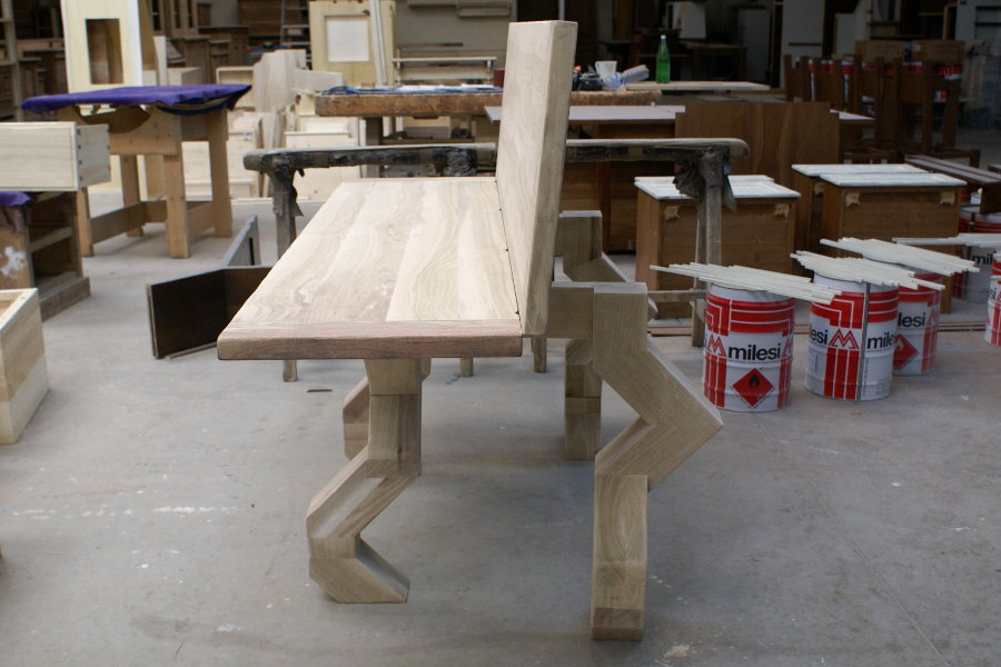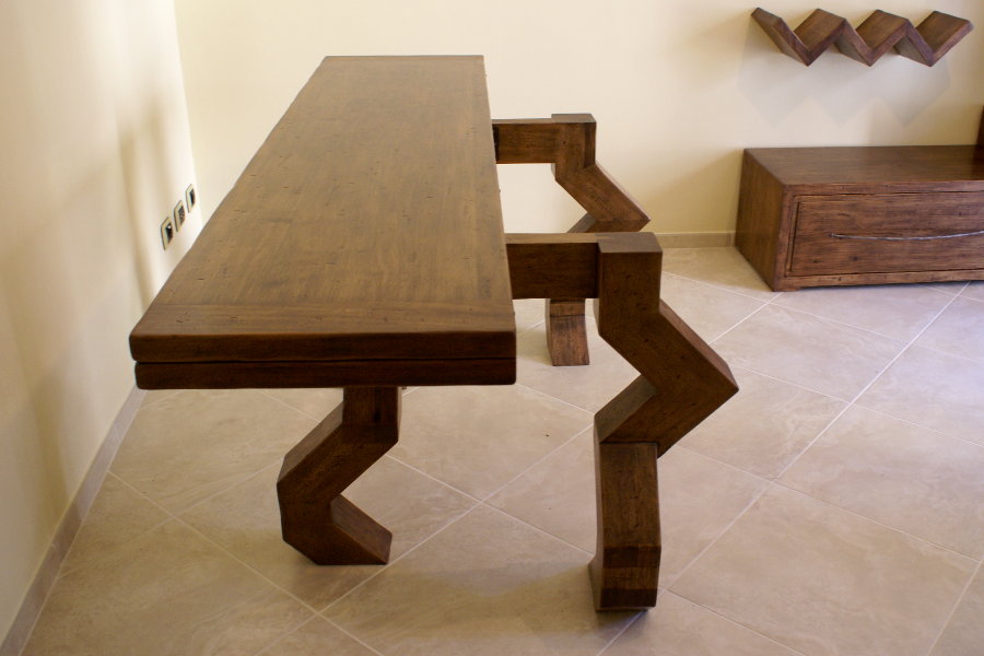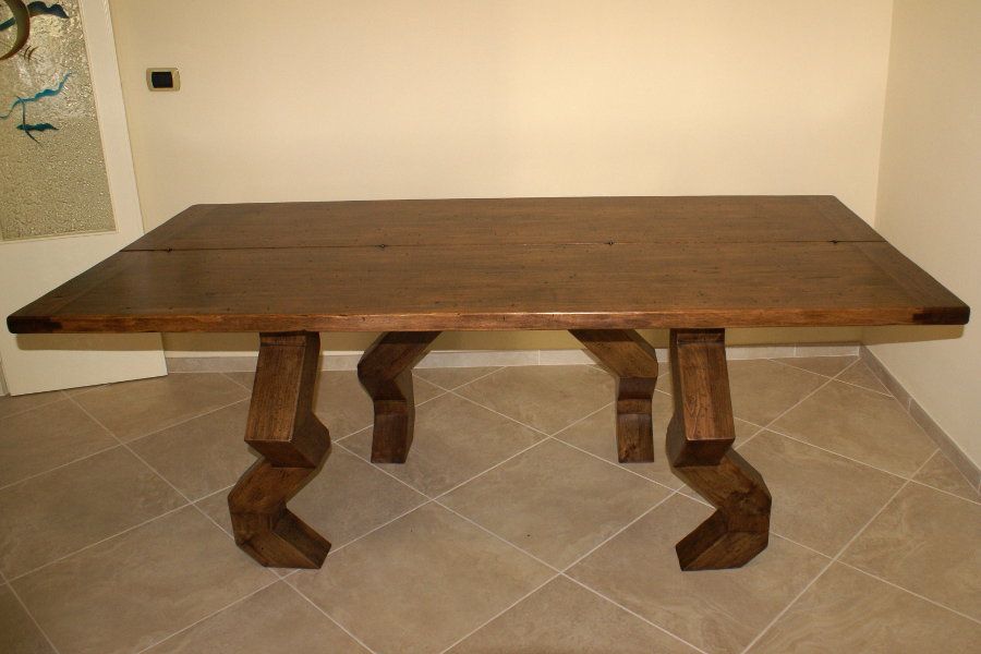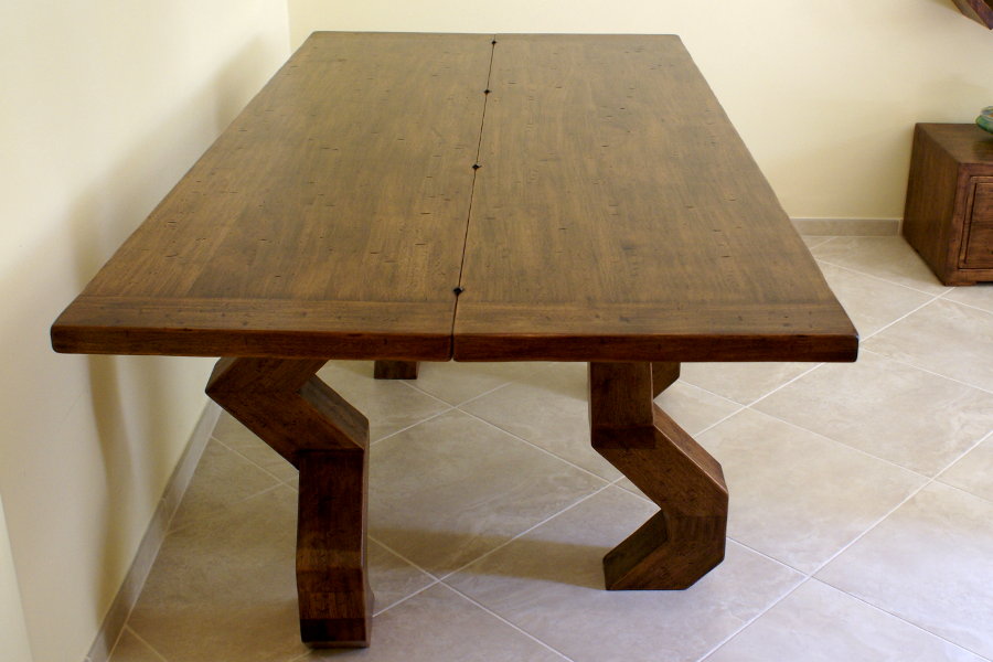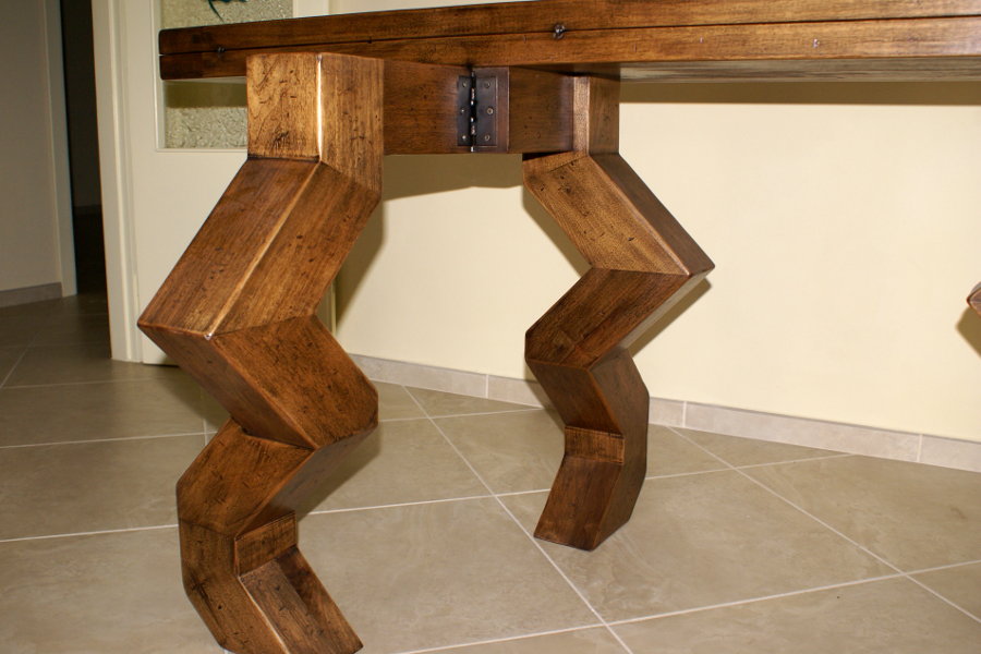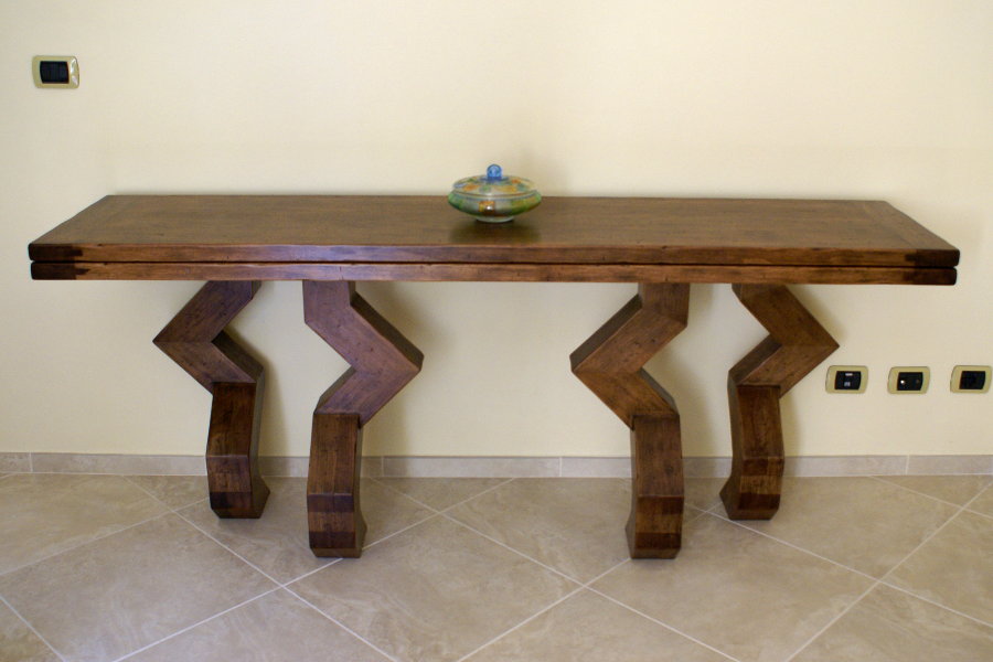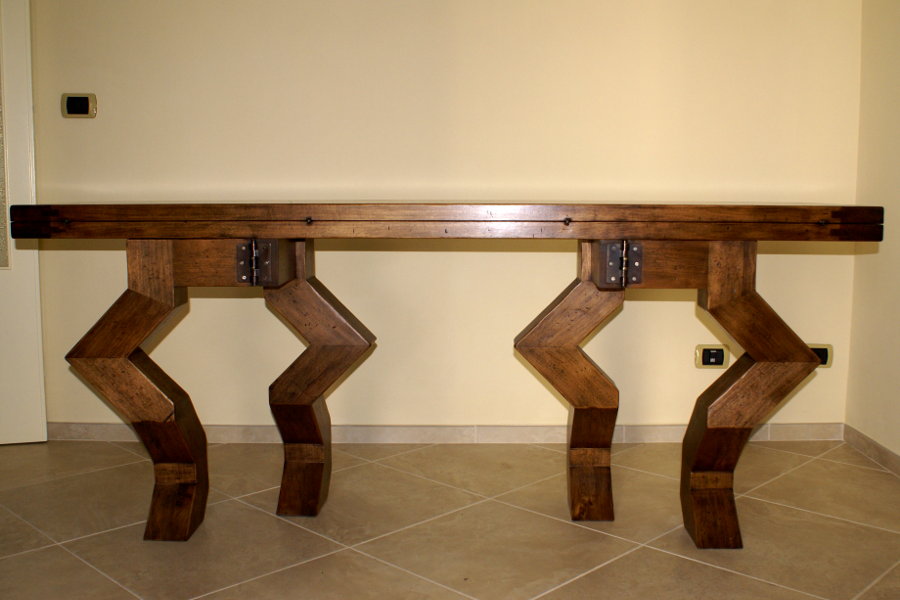 Tavolo consolle moderno realizzato su misura e su disegno, con gambe particolari. La consolle, aprendosi, diventa un comodo tavolo da pranzo. Possiamo realizzare tavoli consolle su misura di piccole dimensioni, collocabili anche in uno spazio più ristretto.