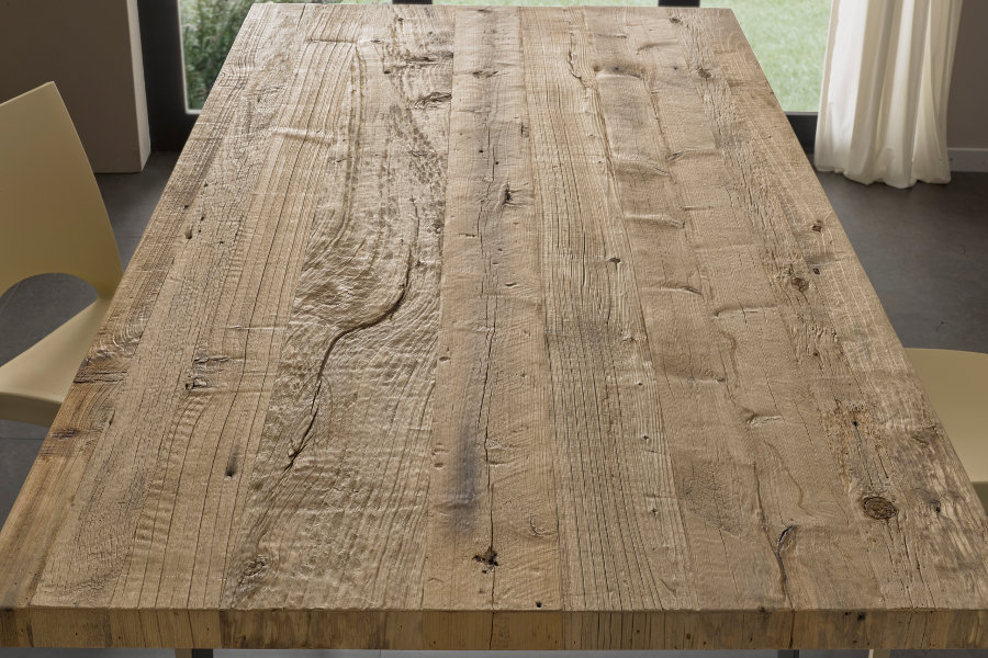 Questo tavolo moderno con piano in ontano trattato cera naturale ha il piano con uno spessore di 45 mm.