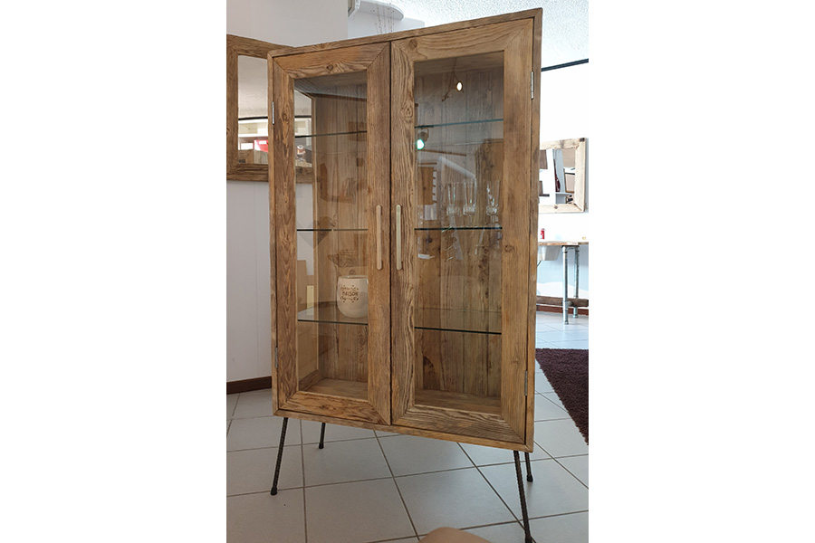 Vetrina in legno vecchio di abete, realizzabile anche su misura. Questa vetrina vuole riprendere lo stile anni ’60 con le tipiche gambe in ferro, sottili e posizionate in diagonale. Il vetro è trasparente sia nei ripiani che sugli sportelli ed i lati della vetrina. Il legno restaurato è finito al naturale.